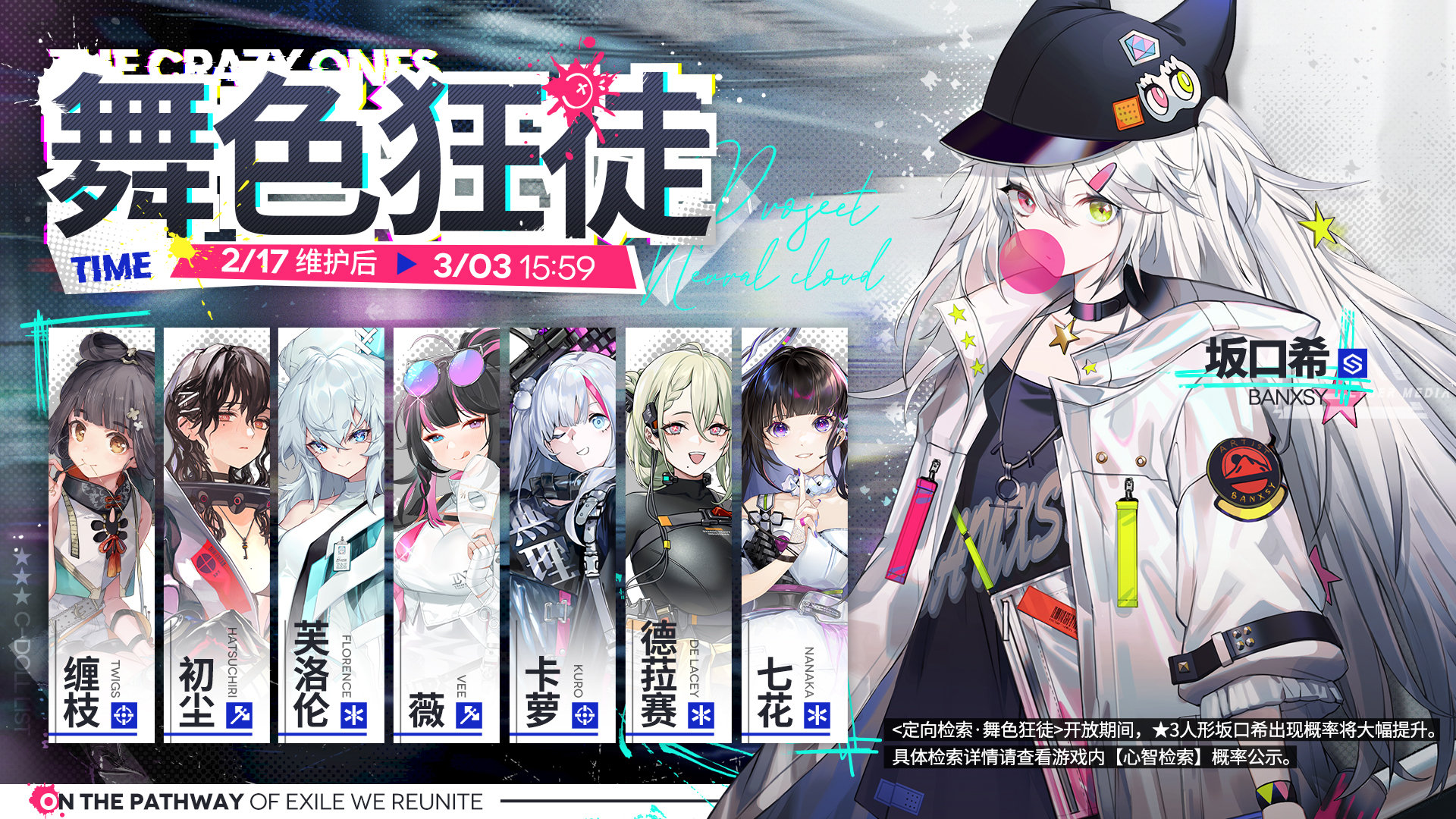 亲爱的教授,2月17日维护后~3月3日 15:59期间,定向检索·舞色狂徒将限时开放!开放期间,⭐3人形坂口希出现概率将大幅提升。