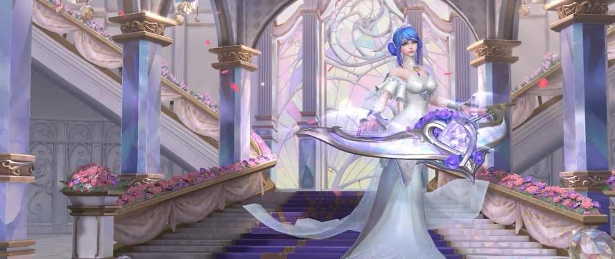 2.琴女,花嫁娑娜,这款皮肤的特效有紫色手捧花以及魄罗环绕,非常灵动