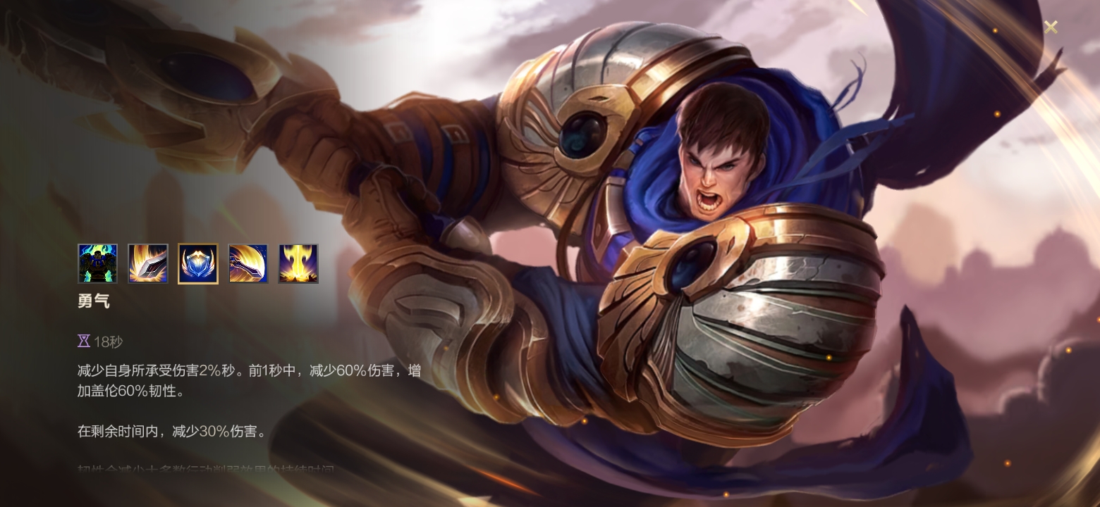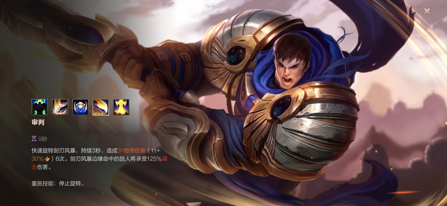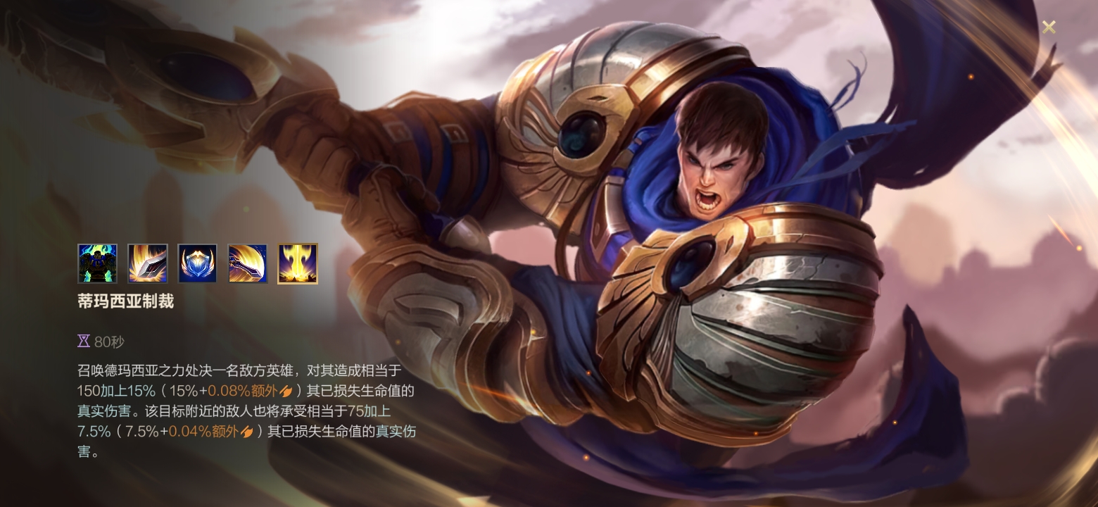 这个是盖伦最后的大招,盖伦召唤德玛西亚之力,试图处决一名敌方英雄,注意好时间谨慎使用。