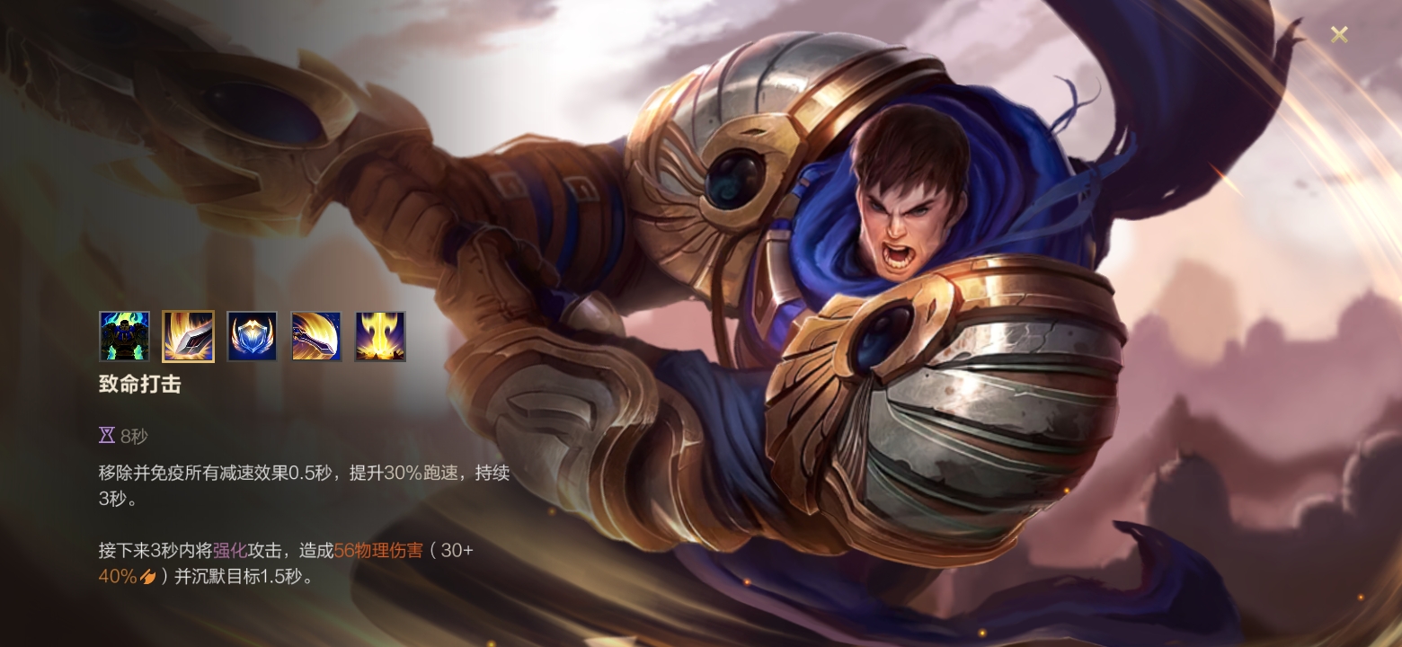使用这个技能之后能够是盖伦的移动速度提升很快,并且会把身上的带有的减速效果都给消除了,释放技能后的第一次攻击命中敌人的关键位置,就能够造成大量的伤害以及使目标处于沉默状态。