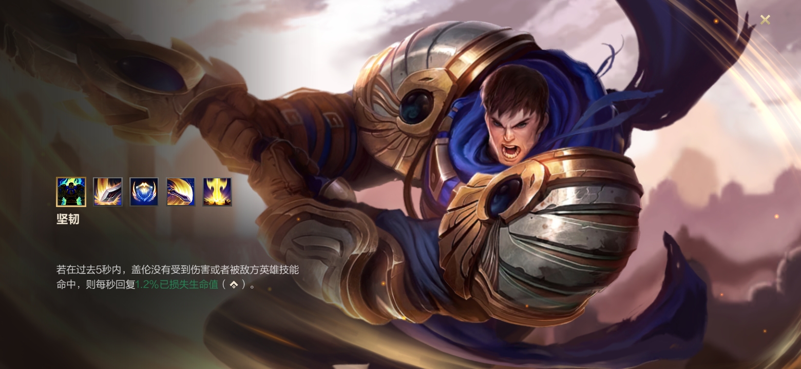如果盖伦在一段时间内容没有被地方英雄攻击或者受到了技能的效果,那么他就可以在每秒恢复一定的血量值,这个可以减少英雄回泉水的时间。
