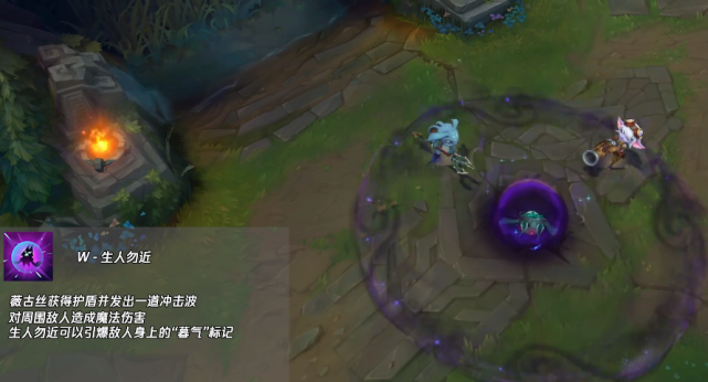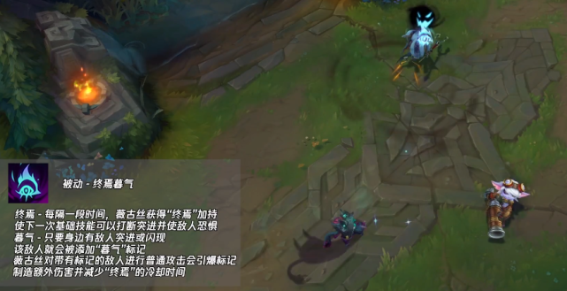 暮气 - 只要身边有敌人突进或闪现,该敌人就会被添加“暮气”标记。薇古丝对带有标记的敌人进行普通攻击会引爆标记,制造额外伤害并减少“终焉”的冷却时间。