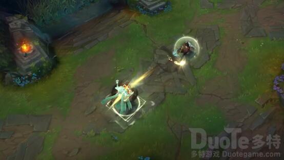 这个技能同样地与纳尔的Q技能十分类似,投掷出一个回旋镖,这个回旋镖可以触发被动,回旋镖在击中目标后会得到一个延长距离的效果。