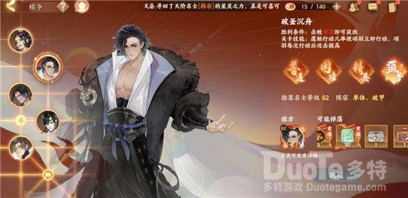 以项羽为首领的敌方棋子阵容为一个帅、一个士、三个兵,普通阵容为两个控制、三个输出,本关的攻击和控制能力非常强,因此使君在挑战本关时,可以选择单体攻击、破甲的名士阵容。