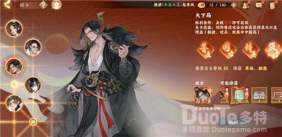 以刘邦为首领的敌方棋子阵容为一个帅、一个士、两个象、一个炮。普通阵容为两个防御、一个控制、一个辅助、一个输出。因此,使君在挑战本关卡时可以选择单体、驱散的阵容,并且在开局时一定要先击败一个象,免除敌方帅的“免死金牌”。
