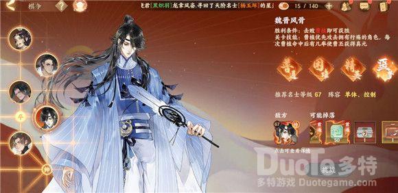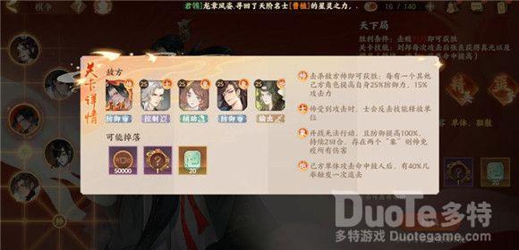 以曹植为首领的敌方棋子阵容为一个帅、一个士、两个炮、一个车,普通阵容为三个输出、一个辅助、一个治疗。这关的伤害比较高,因此使君可以选择单体、控制的阵容。并且,由于输出的血量一般比其他名士要“脆”,所以开局后可以先将为输出增加血量的治疗名士击败,再对其他敌人进行攻击。