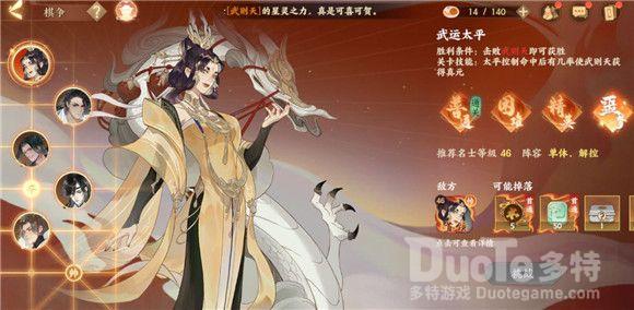 接下来,就让我们看一下挑战不同首领需要搭配什么阵容吧。首先,以武则天为首领的敌方棋子阵容是一个帅、两个士、两个车,普通阵容是两个输出、两个控制、一个治疗。因为本关卡攻击和控制能力偏强,所以使君应该选择解控和单体攻击的名士组合来对敌。