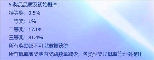 所有奖励均不可重复获得,随着奖池内奖励数量的减少,各类型奖励的概率会等比例提升。