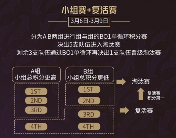 所有参赛队伍将分为A组与B组进行小组赛,每组实行BO1单循环积分赛。