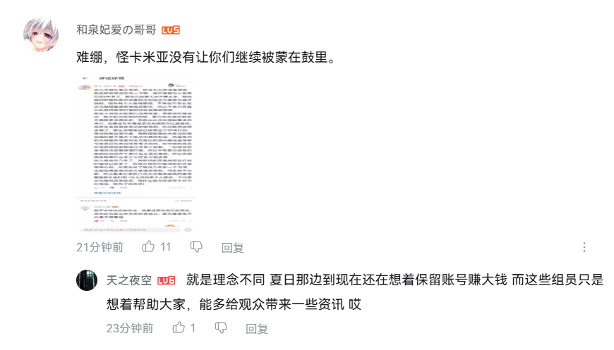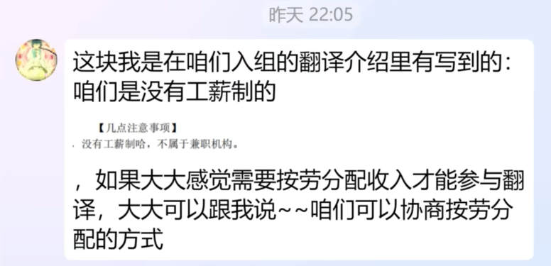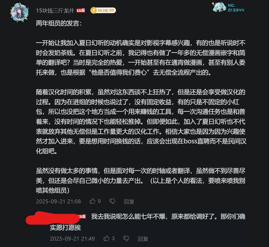 但随后随着事情的发酵,越来越多夏日幻听的组员们的反应将这事坐实了。首先是主要翻译者“千早爱音”表示:“我在知道组长的收入后也傻了,我在这事里谁也不占,所以我退出。”