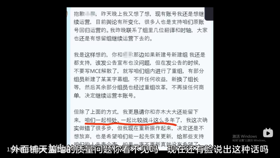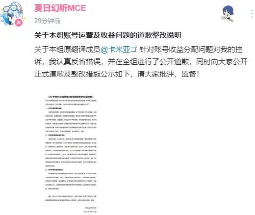 最后在两人的规劝下,他们达成了协议,首先就是发布道歉声明(这相当于承认了卡米亚的证据与质疑),其次就是变更运营方式,简答来说就是MCE这个账号运营权给亦木,然后重组字幕组,启用新账号从0开始,真正的为爱发电。如果新账号还有收入,那会透明分配。