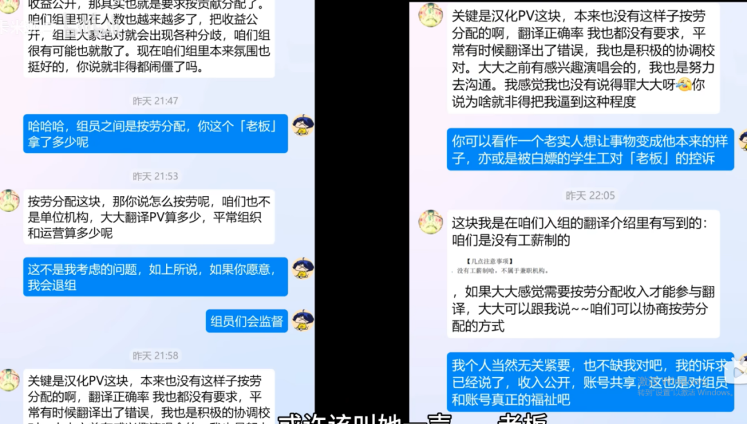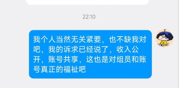 也就是综合算下来,组长本人一人拿走了整个账号90%的收入。随后卡米亚找到了组长本人对质,要求他公开账号收益,并且说明收益去向。但组长却一直以:“我们字幕组不是营利机构,没办法按照劳动分配收入。。。”等借口搪塞。