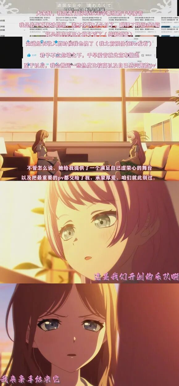 如果说千岛爱音还只是单纯的不想掺和浑水的话,那另外两位组员就是彻头彻尾的“被组长背刺了”;这两位组员一位叫做“亦木”专门负责时轴,还有一位不想透露ID的翻译“小W”