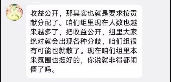 后来在卡米亚的一再逼问下,组长直接把他踢出了群聊,并坚持不公开收益,原因是:“收益公开,组员就会产生分歧,然后大伙就会散摊子.....”