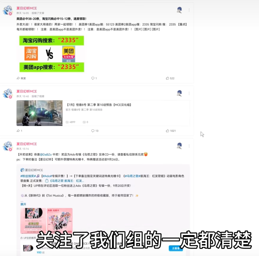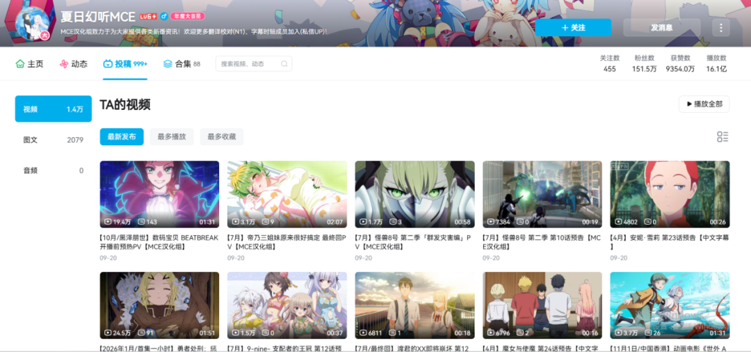 事情是这样的,B站ID为“夏日幻听MCE”的账号,主要发布的内容就是一些动画PV的汉化,因为汉化速度很快,基本上官方发布PV后没有半小时就可以出汉化,所以几年下来积累了150万粉丝,绝对如今的顶流字幕组之一了。