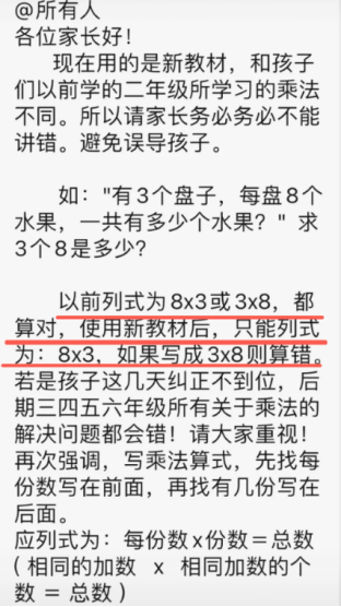 此时你可能会吐槽,“这结果不都一样的吗,有必要搞顺序这种东西吗?”,有这种情绪是正常的,毕竟那帮带小孩的家长们也是这么想的,而如果你要个解释,老师们会告诉你在写乘法算式时,一定得遵循每份数×分数=总数的规则,因为新教材就是这么规定的。