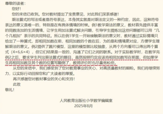 虽然聊天记录里那位老师的回应没什么大毛病,在实际的乘法运算中每个数确实都代表着不一样的含义,但我仔细回想了一下我小时候考试那阵,印象里好像也确实没有遇到过因写错顺序而被判错的情况。