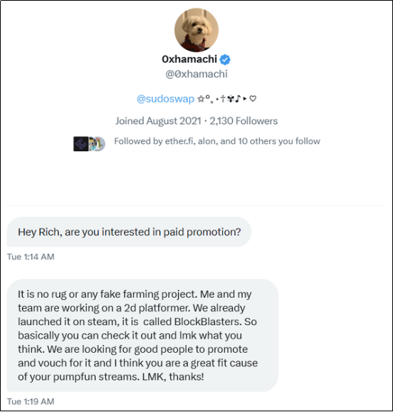 同时调查人员还发现,这些受害者往往都有一个共同的特点,他们都是持有大量加密货币的用户,欺诈人员一般会给他们发推特私信,并且会编造各种理由来诱骗他们去玩那款游戏,但是也不是每一个人都会上当的,比如有人就晒出了相关的截图,对方谎称是游戏开发团队的人,希望借此机会能和博主谈谈合作推广的事,不过最终是以钓鱼失败而告终。