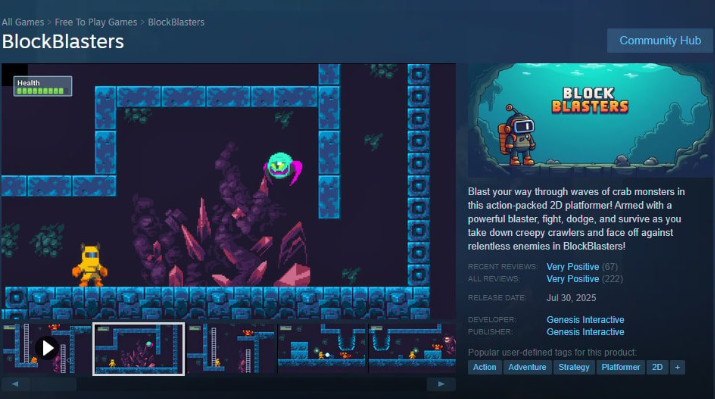 始作俑者是这个叫《BlockBlasters》的免费游戏,根据商店页面显示它是在今年7月30日推出的,从卖相上看这就是一个普普通通的2D平台跳跃游戏,虽然评论不多,但总体口碑却保持在一个特别好评的成绩,活脱脱一副冷门佳作的定位。