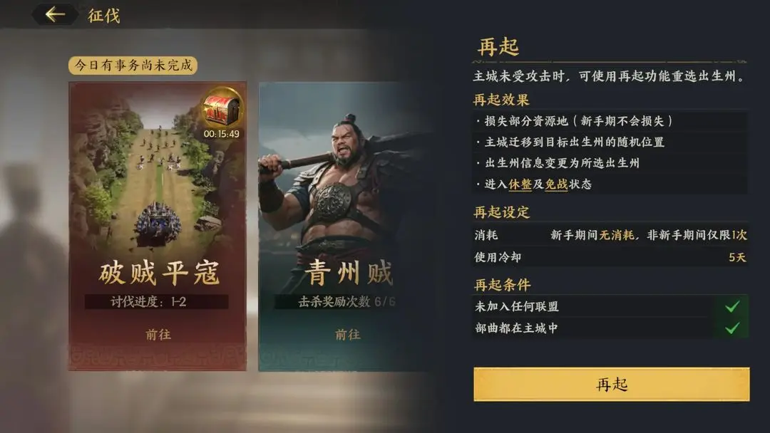 3、主城附近可占领资源地不多时可使用“再起”或“迁城”换地,也可选择“破免”翻地(会提前结束保护)。