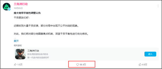 10月5日,游戏官方发布了最新的更新公告,对地图的撤离点机制和“深蓝”这名干员进行了优化调整,消息一出立马就引发了玩家们的不满,截至目前,该公告的回复量已经来到了56万,与过往只有几百几千回复量的公告形成了鲜明对比。