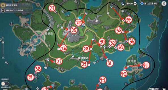 1、伊黎耶林区水神瞳的分布位置以及收集路线可以参考下图所示: