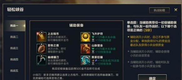 挑战一:当辅助携带任一初级辅助装备,与队友一起作战时,以下哪个选项是正确的(5分)