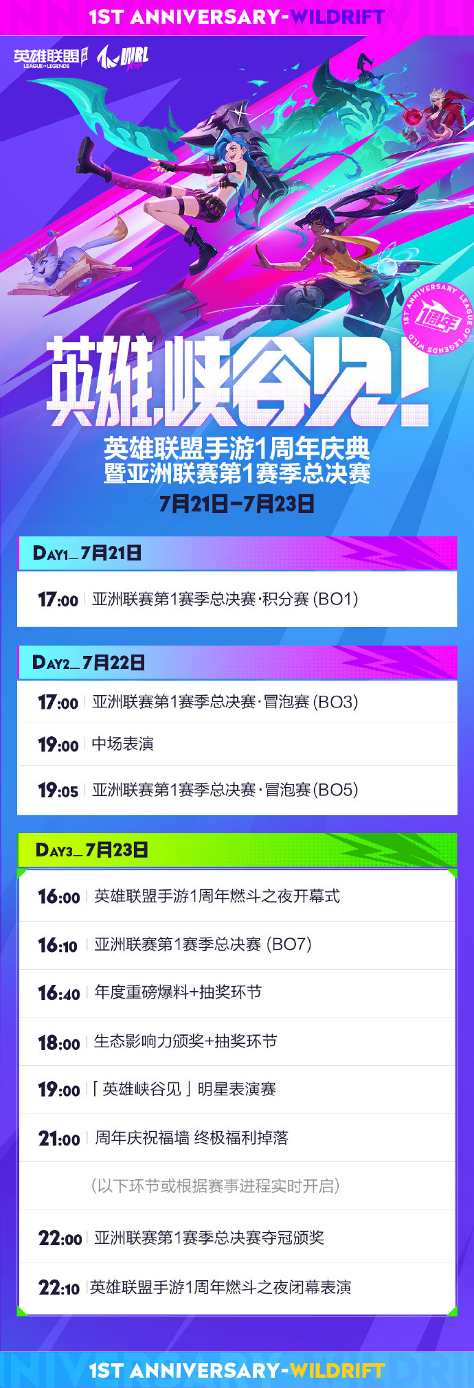 英雄联盟手游1周年#庆典即将拉开帷幕!为大家准备了节目单,其中,亚洲联赛第1赛季总决赛将于7月21日在北京JDG英特尔电子竞技中心打响,于7月23日上演冠亚军角逐7月23日英雄联盟手游1周年燃斗之夜也将在客户端和线下同步开启,新老朋友齐聚明星表演赛、年度趣味颁奖、直播福利抽奖等丰富内容轮番来袭,期待召唤师们的参与和互动!