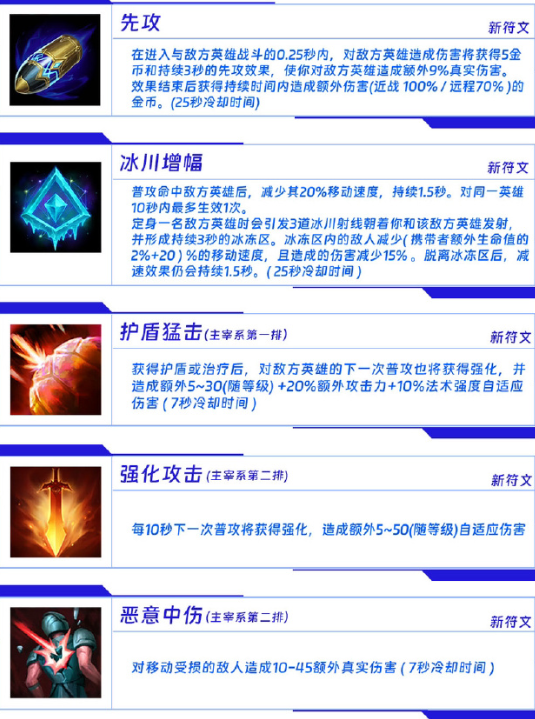 获得护盾或治疗后,对敌方英雄的下一次普攻也将获得强化,并造成额外5~30(随等级)+20%额外攻击力+10%法术强度自适应伤害(7秒冷却时间)