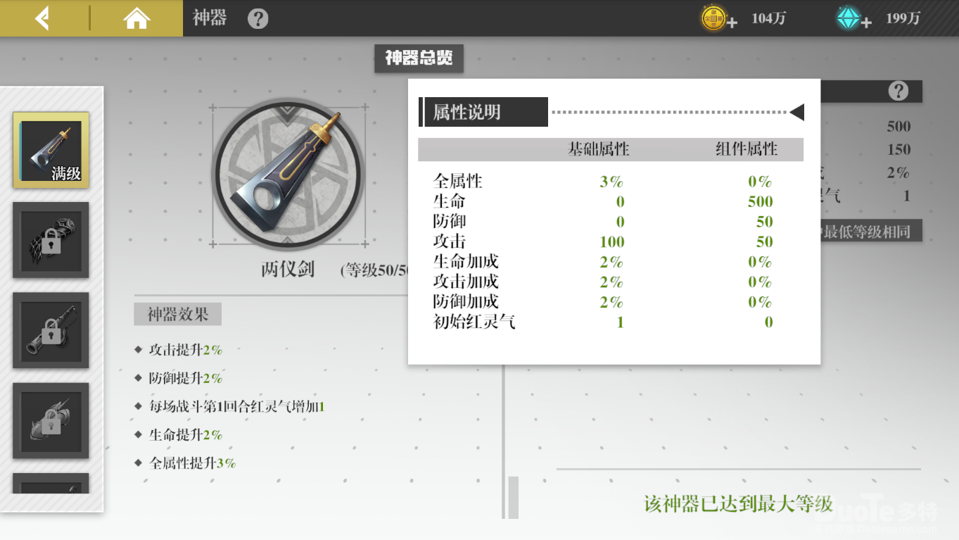 当挑战芦花古楼达到一定的层数时,会解锁对应的神器,升级神器的材料由解锁神器的关卡决定,并且当神器升级到一定等级时,会激活大量的属性加成以及特殊的神器技能。