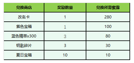 每种奖励对应了不同的蜜露数量,兑换即可解锁相应的奖励~活动结束后,多余的蜜露将以1:1的数量兑换成蓝色精萃,自动发放至玩家的背包。