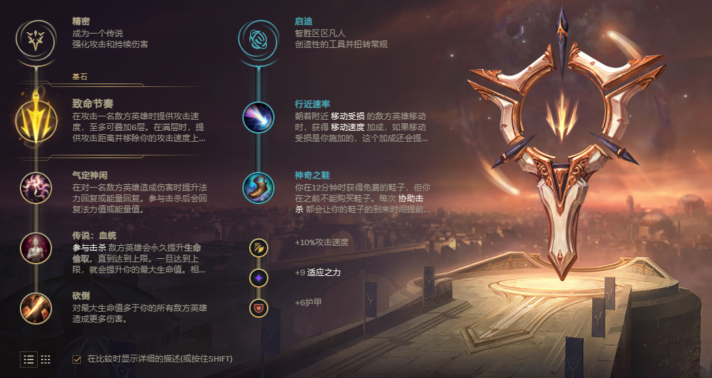 符文选择致命节奏,应该没有比艾希的符文更固定的AD了吧?副系必定是带行进速率和鞋子的,这套符文可以用到符文改版。
