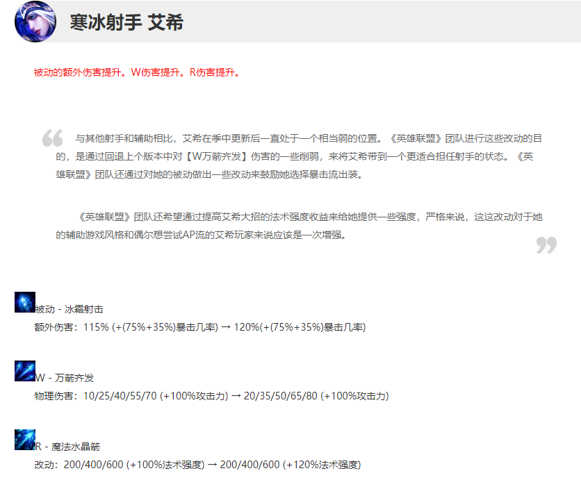 各位小伙伴大家好呀~今天咱们要来看一个很有意思的英雄,这个英雄就是冷门到不行的寒冰,寒冰在最近的版本里吃到了一次不错的增强,这也让艾希的胜率有所提升,俨然一副要起飞的样子,今天咱们就一起来看看。