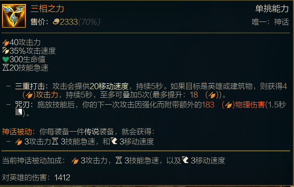 三相这件装备大木给大伙推荐很多次了,可以说是当前版本的最强神话装备,对于艾希来说,属性全面而且都好用,艾希本身就具有耀光系的出装思路,以前吸蓝刀还是艾希的必备装备呢,利用Q技能和W技能来触发三相效率也是不错的,关键是三相的攻击力提升,极大程度的改善了艾希刮痧的问题,羊刀艾希攻速虽然快,但刮起来也是真的刮。