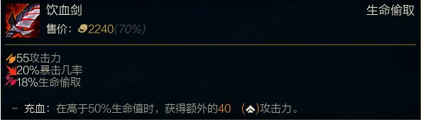 除了幽梦以外,还有一件装备对男枪来说也很重要,那就是饮血剑,这件装备虽然不适合前三件就做,但在后续的出装路线上,饮血剑是很高性价比的,他的充血被动能够提供额外的攻击力,这对于男枪来说是非常关键的,攻击力收益极高!