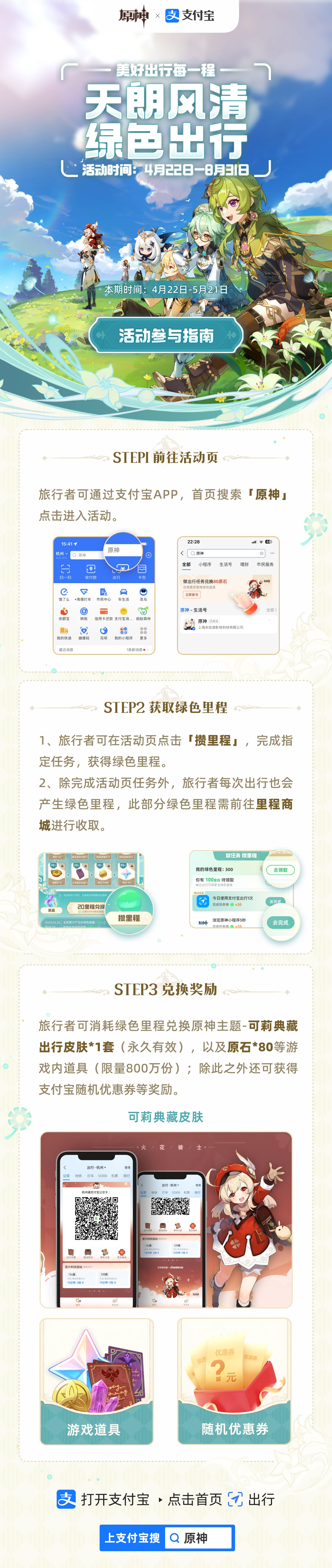 4月22日起,上支付宝搜「原神」,点击下方提示卡片直达出行活动页,完成绿色出行任务积攒绿色里程,兑换丰富游戏奖励。每期奖励持续更新~