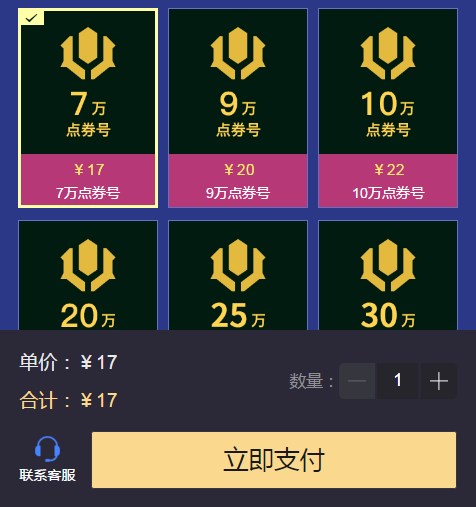 第三步:确认想要购买的账号面额,这里有点券 号还有箱子号可以选择,不同的账号也有很多不一样的价格可以选择性的购买,选中账号之后点击下方的立即支付。