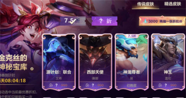 4、传说皮肤折扣:可以获得两张折扣卷,第一次免费,第二次消耗三千的蓝色晶石获得,折扣最低为6.5折,最高是8折;