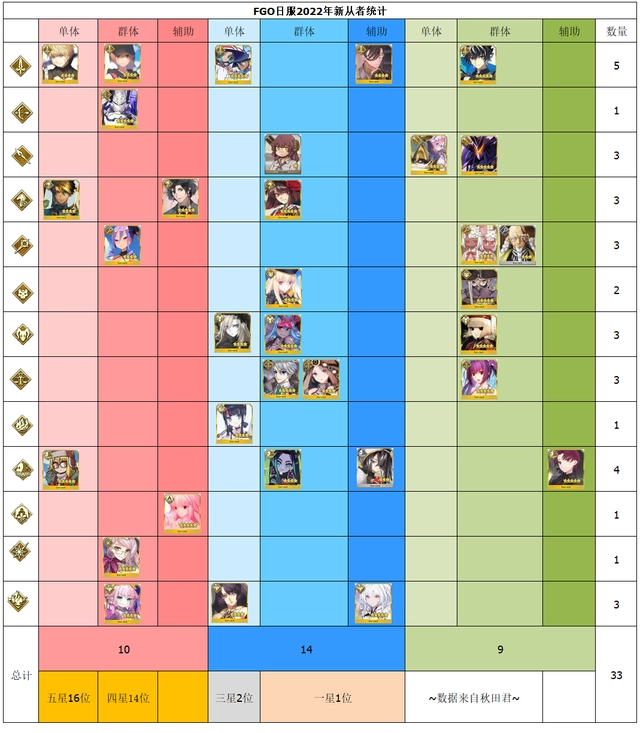 先说总数,今年一共实装了33骑从者,比去年实装的从者总数多了2骑,数量算是稍微提升了。