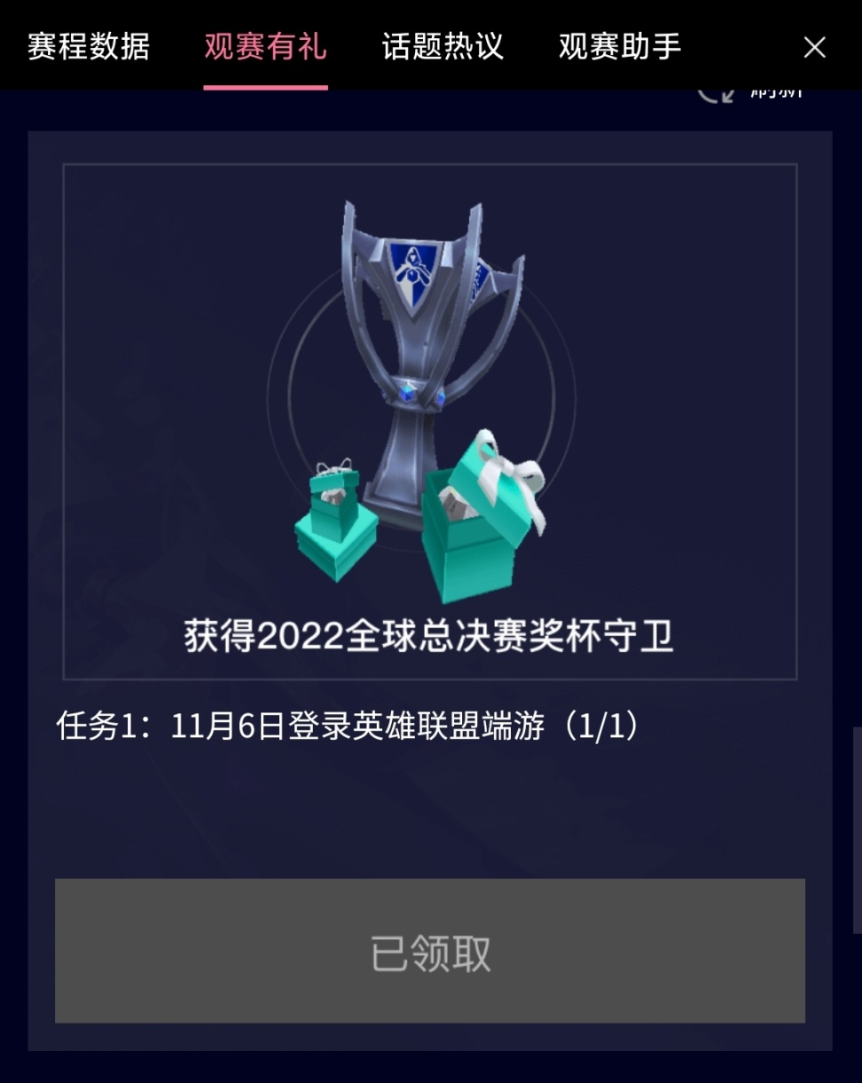 虽然总决赛已经结束了,但还是可以进入英雄联盟官方直播间去领取2022全球总决赛守卫皮肤。