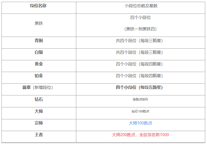 手游版本有10个段位,由低到高分别是:黑铁,青铜,白银,黄金,珀金,翡翠,钻石,大师,宗师,王者。其中,翡翠是新增的段位,高于铂金低于钻石。