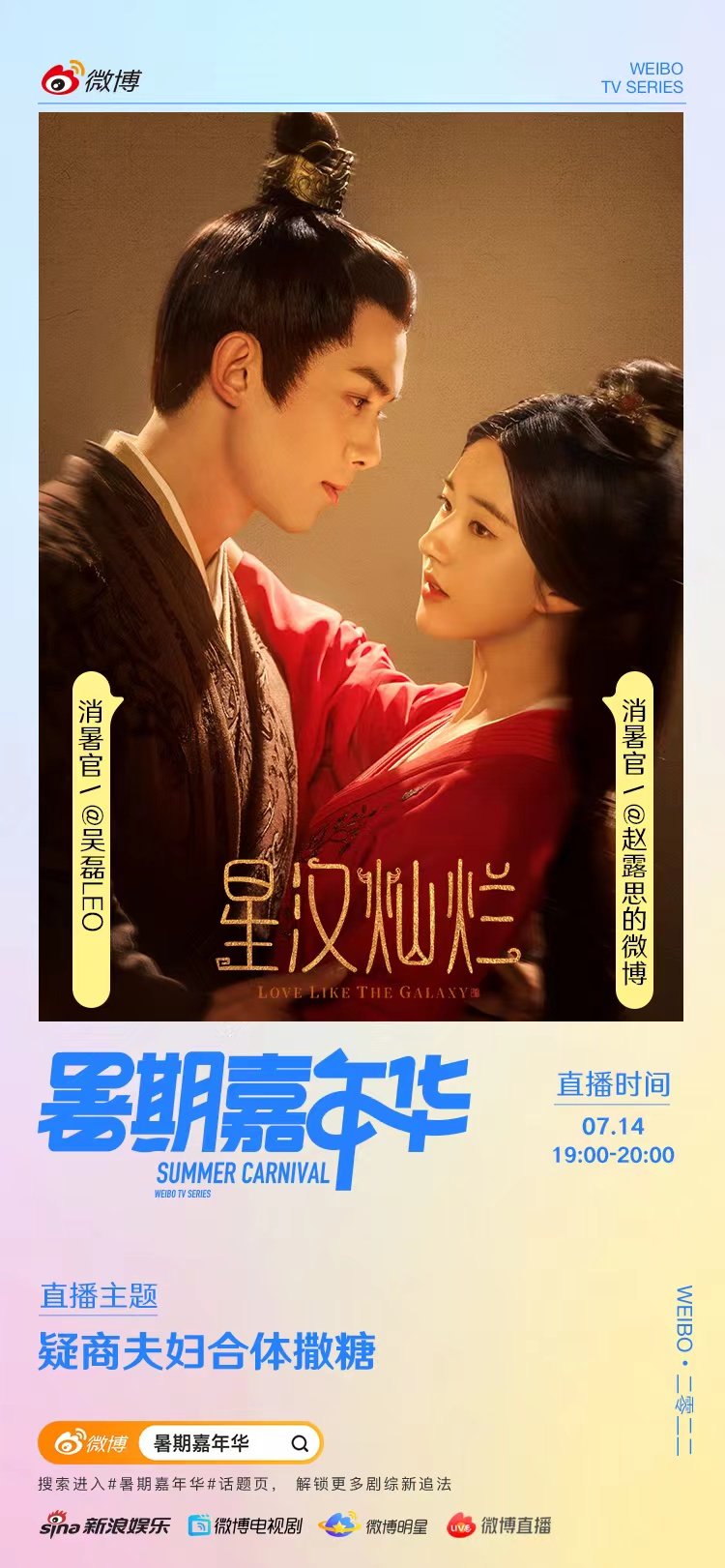 小家主温馨提醒:明晚19:00,疑商夫妇@吴磊LEO @赵露思的微博 连麦直播!星上人们不要错过,抓紧定起闹钟快来捡糖啦~