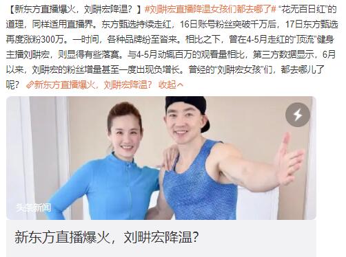 有部分网友拿刘畊宏直播和新东方直播相比,然后对刘畊宏直播讽刺一番,说他的粉丝开始呈现负增长了,他的热度已经降下去了。自16日账号粉丝突破千万后,17日东方甄选再度涨粉300万。