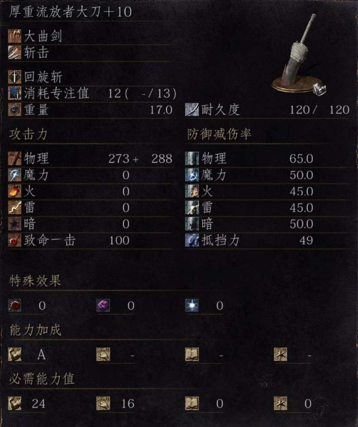 到了后期流放者打不太动,上了200的面板武器还是猎斧,巨剑,这类的输出高,硬直大。流放者的好处是一周目力量号更肉,新手用盾不好把握精力条,不如直专接拿流放者砍,很多属时候不会打的boss硬直处决就过了。流放者大刀的优势是获得地点最早的大曲刀武器。