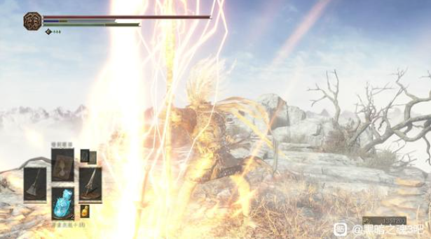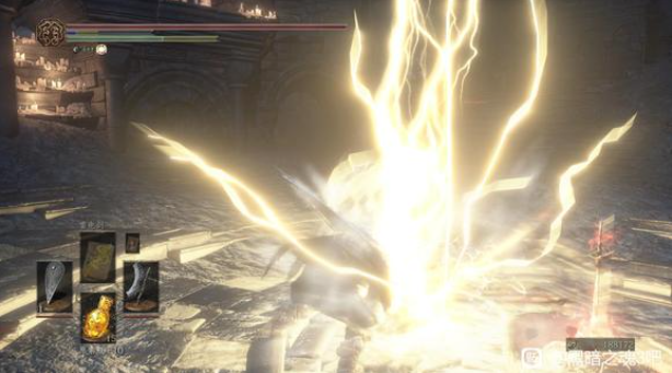 战技还是很帅的,先非常缓慢的搓枪,然后一个天雷,顺便给枪附魔80雷。战技看起来像天降正义,但实际上是一条直线发出去的,和敌人中间有障碍物就会打不到,有点悲催。而且速度很慢,除了偷袭很难有机会出手。所以战技主要还是拿来附魔。40力敏下附魔后面板在600左右,对于枪来说还是挺不错的了(可惜只有30秒)