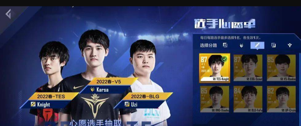 上单:呼吸哥,打野:小天或Tarzan,中路:Scout或Knight,下路:viper,辅助:meiko,不过这里有个问题就是lwx和crisp的战力数值超过87,所以不能加入心愿单。第一次十连必出ale bin theshy中的一位上单