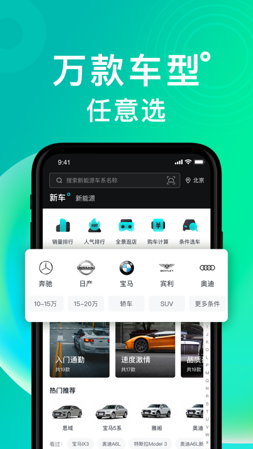 支持根据价格、等级、国家等条件定制选择适合的车型,专业试驾报告、评估