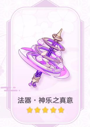 神乐之真意为五星法器,是八重神子的专武,在使用时释放元素战技获得神乐舞效果,使角色的元素战技造成的伤害提升12%,效果持续16秒,最多叠3层;叠到3层时获得12%的所有元素伤害加成。