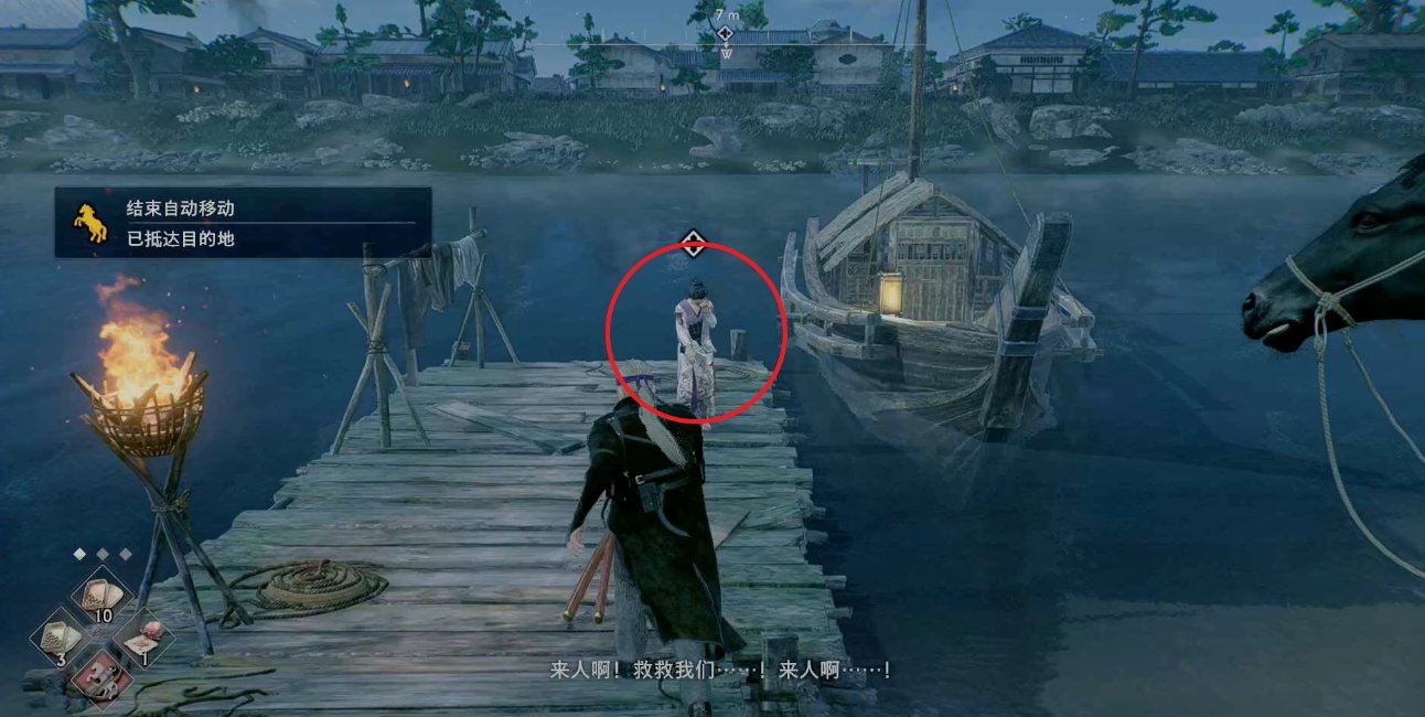 与河边的女子对话得知一群恶棍绑走了他的主人,所以希望我们能帮助他。