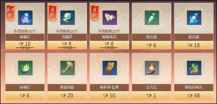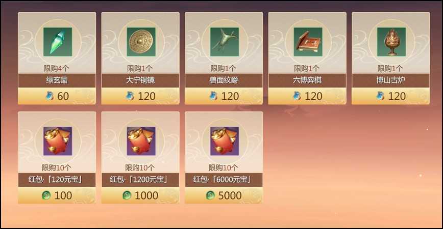 元宝:所有货币中用处最多最广的一项,奇珍阁元宝商店可购买大部分游戏材料、护法招募与护法技能招募、家族拍卖与世界拍卖。是获得装备和材料的主要付出货币。